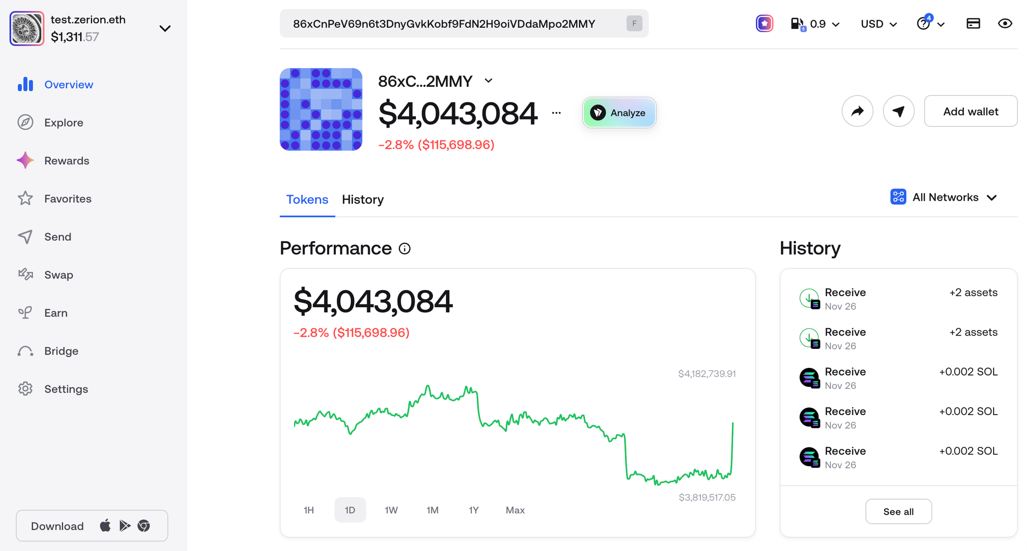 The easiest way to check is to just paste a Solana address into Zerion web app’s search field.