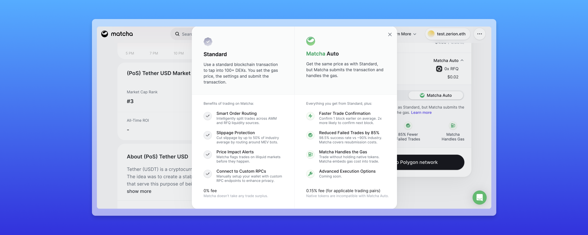 On Ethereum or Polygon, you can also turn on Matcha Auto for MEV protection, gasless swaps, and optimal trade execution. In that case, Matcha submits the transaction to the blockchain, covering gas and increasing execution speed. Auto charges a 0.15% fee.