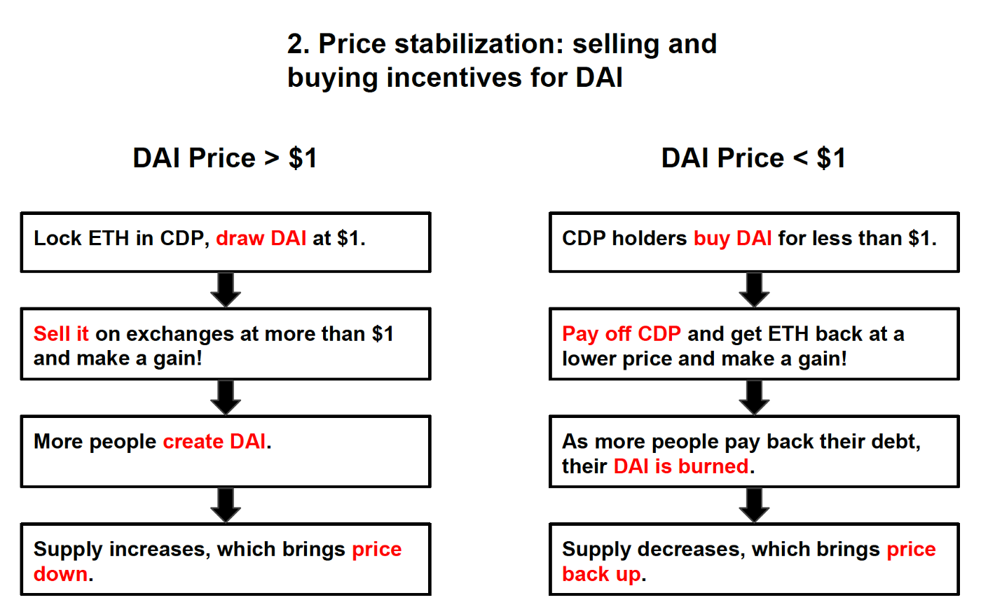 Conversely, when Dai supply is more than demand and its price falls below $1, Dai holders can make a gain on paying off their debt, which triggers the burning of their Dai, and therefore decreased supply, pushing prices back up.