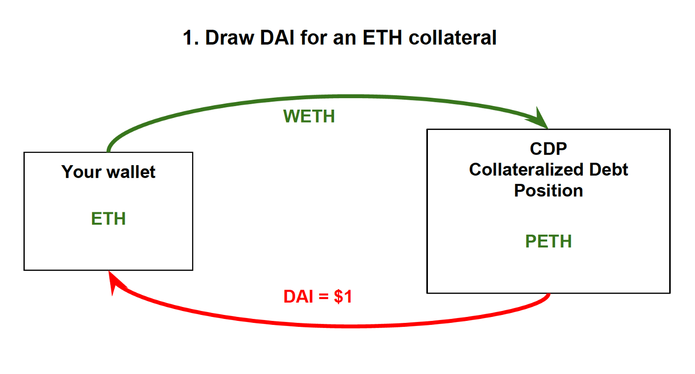 In the first step, anyone can draw Dai against an Ether-backed collateral. The process is like taking out a loan and requires the wallet holder to wrap the ETH into WETH, which then becomes pooled ETH, PETH, in a pooled collateralized debt position CDP.