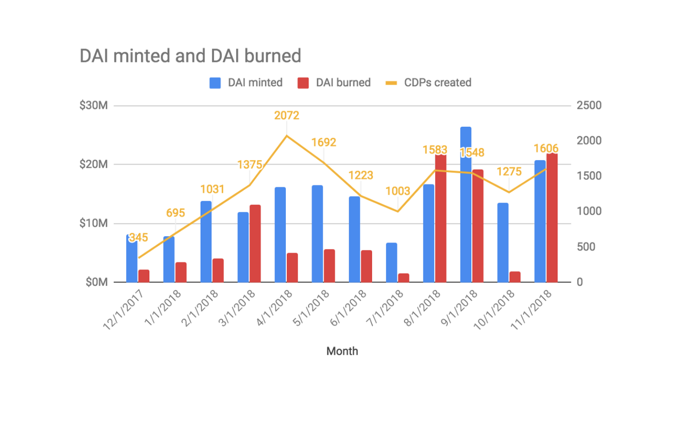 The chart below shows all the Dai minted through CDP creations, and all the Dai burned when lenders pay back their Dai loans to unlock access to their collateral.