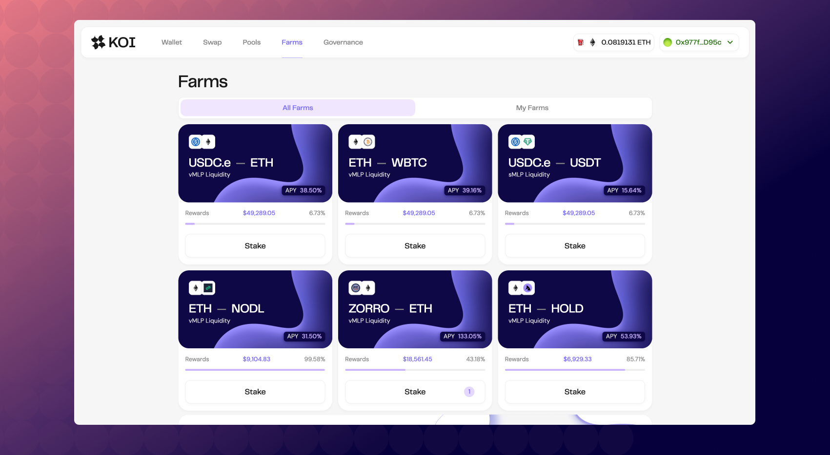 With Koi, you can also stake your LP and earn attractive rewards in various tokens. For example, for being an LP for ZORRO, a zkSync memecoin, you can earn a triple-digit APY.