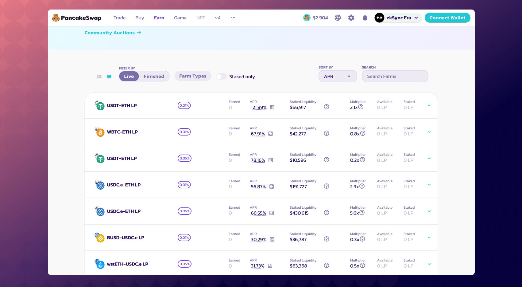 Although volumes and TVL are still lower than on zkSync-native DEXes, PancakeSwap offers attractive yields in its CAKE tokens when you provide liquidity and stake the LP.