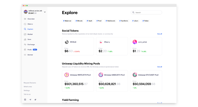 Zerion lets you buy and sell DeFi tokens in a single transaction. We now support trades for thousands of tokens — including Uniswap, Balancer and Curve pools; yearn vaults; social tokens, and more.